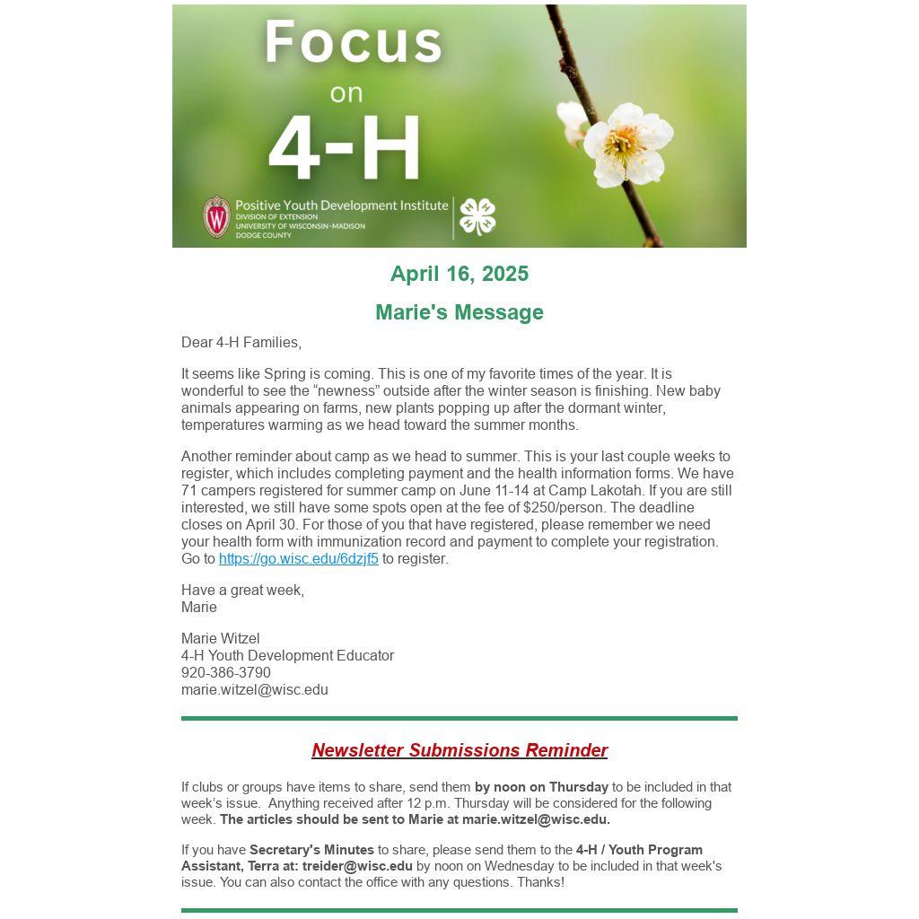 Check your email on Wednesday, April 23th for the next Focus on 4-H!