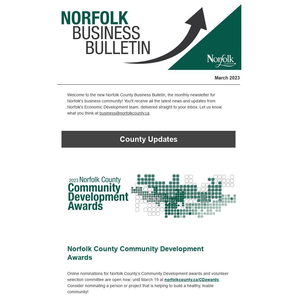 Welcome to the new Norfolk County Business Bulletin, the monthly newsletter for Norfolk's business community! You'll receive all the latest news and updates from Norfolk's Economic Development team, delivered straight to your inbox. Let us know what you think at business@norfolkcounty.ca.