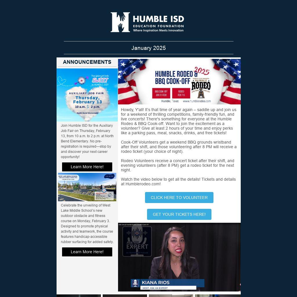 Join Humble ISD for the Auxiliary Job Fair on Thursday, February 13, from 10 a.m. to 2 p.m. at North Bend Elementary. No pre-registration is required—stop by and discover your next career opportunity!