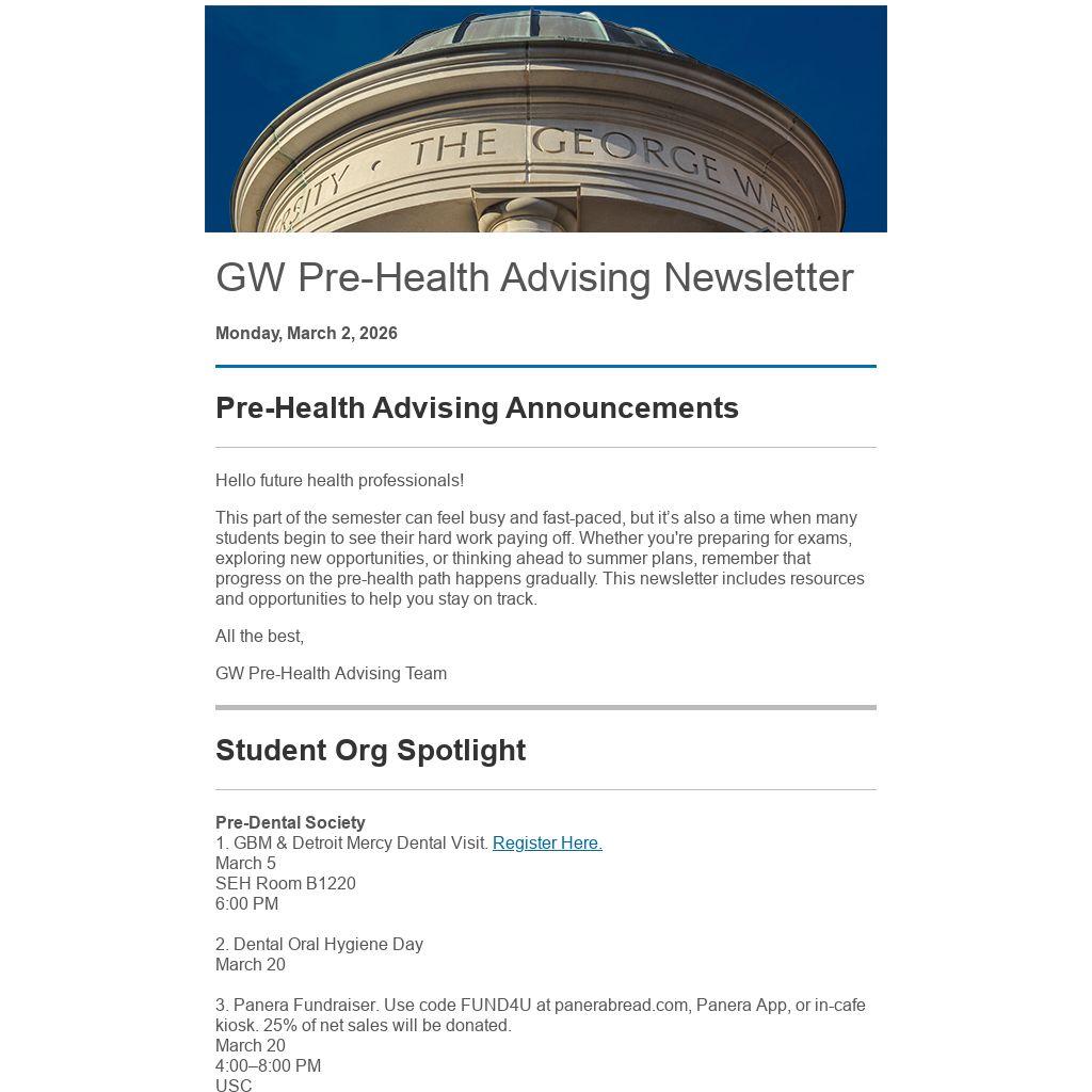 This part of the semester can feel busy and fast-paced, but it’s also a time when many students begin to see their hard work paying off. Whether you're preparing for exams, exploring new opportunities, or thinking ahead to summer plans, remember that progress on the pre-health path happens gradually. This newsletter includes resources and opportunities to help you stay on track.