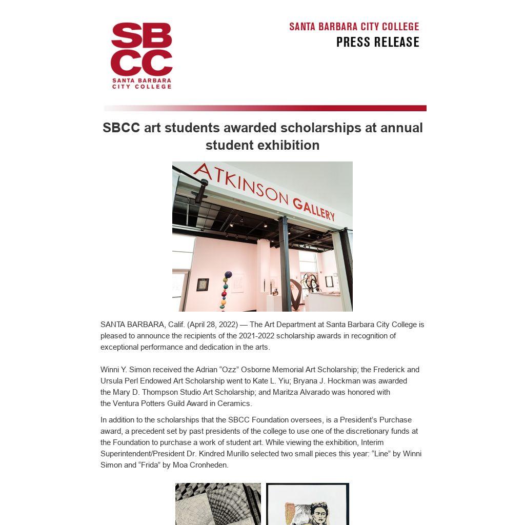 The awards ceremony was held April 14 at SBCC’s Atkinson Gallery during the opening reception for the 2022 Annual Student Exhibition. The exhibit, which remains on view through May 6, 2022, includes the full range of media taught in the department, including 2D design, 3D design, drawing, painting, printmaking and sculpture. The Atkinson Gallery is the art department's showcase for the visual arts, and hosts exhibitions of contemporary art each academic year featuring international, national, regional and student artists working in a wide range of styles and media.