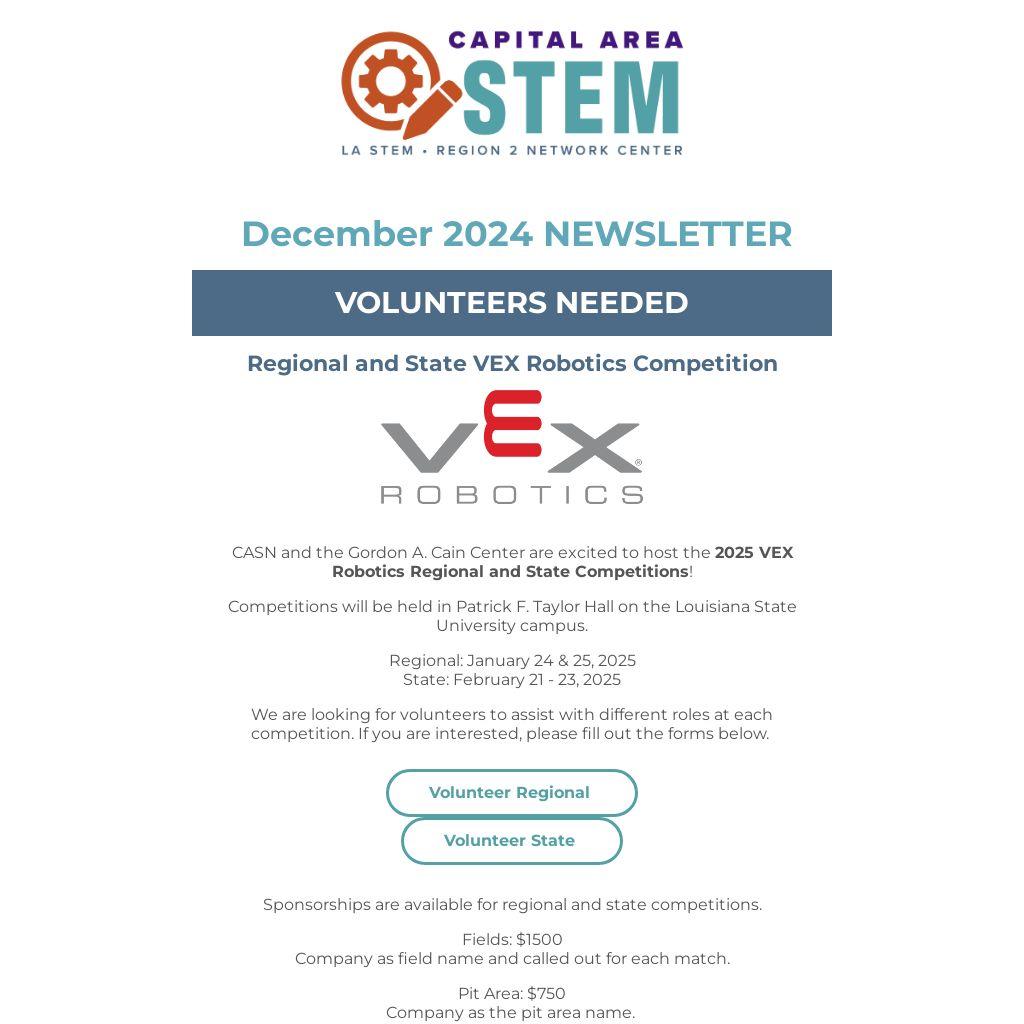 CASN and the Gordon A. Cain Center are excited to host the 2025 VEX Robotics Regional and State Competitions!