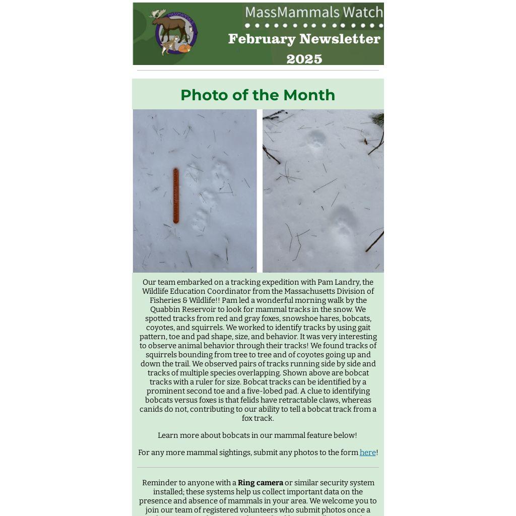 Our team embarked on a tracking expedition with Pam Landry, the Wildlife Education Coordinator from the Massachusetts Division of Fisheries & Wildlife!! Pam led a wonderful morning walk by the Quabbin Reservoir to look for mammal tracks in the snow. We spotted tracks from red and gray foxes, snowshoe hares, bobcats, coyotes, and squirrels. We worked to identify tracks by using gait pattern, toe and pad shape, size, and behavior. It was very interesting to observe animal behavior through their tracks! We found tracks of squirrels bounding from tree to tree and of coyotes going up and down the trail. We observed pairs of tracks running side by side and tracks of multiple species overlapping. Shown above are bobcat tracks with a ruler for size. Bobcat tracks can be identified by a prominent second toe and a five-lobed pad. A clue to identifying bobcats versus foxes is that felids have retractable claws, whereas canids do not, contributing to our ability to tell a bobcat track from a fox track.