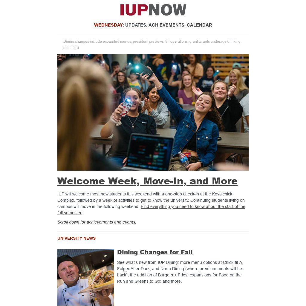 Distributed to IUP employees and students once a week on its summer schedule, IUP Now is the official newsletter of Indiana University of Pennsylvania. It features news from across the IUP website, compiled by the Division of Marketing and Communications. Find out how to get your news and events in IUP Now.