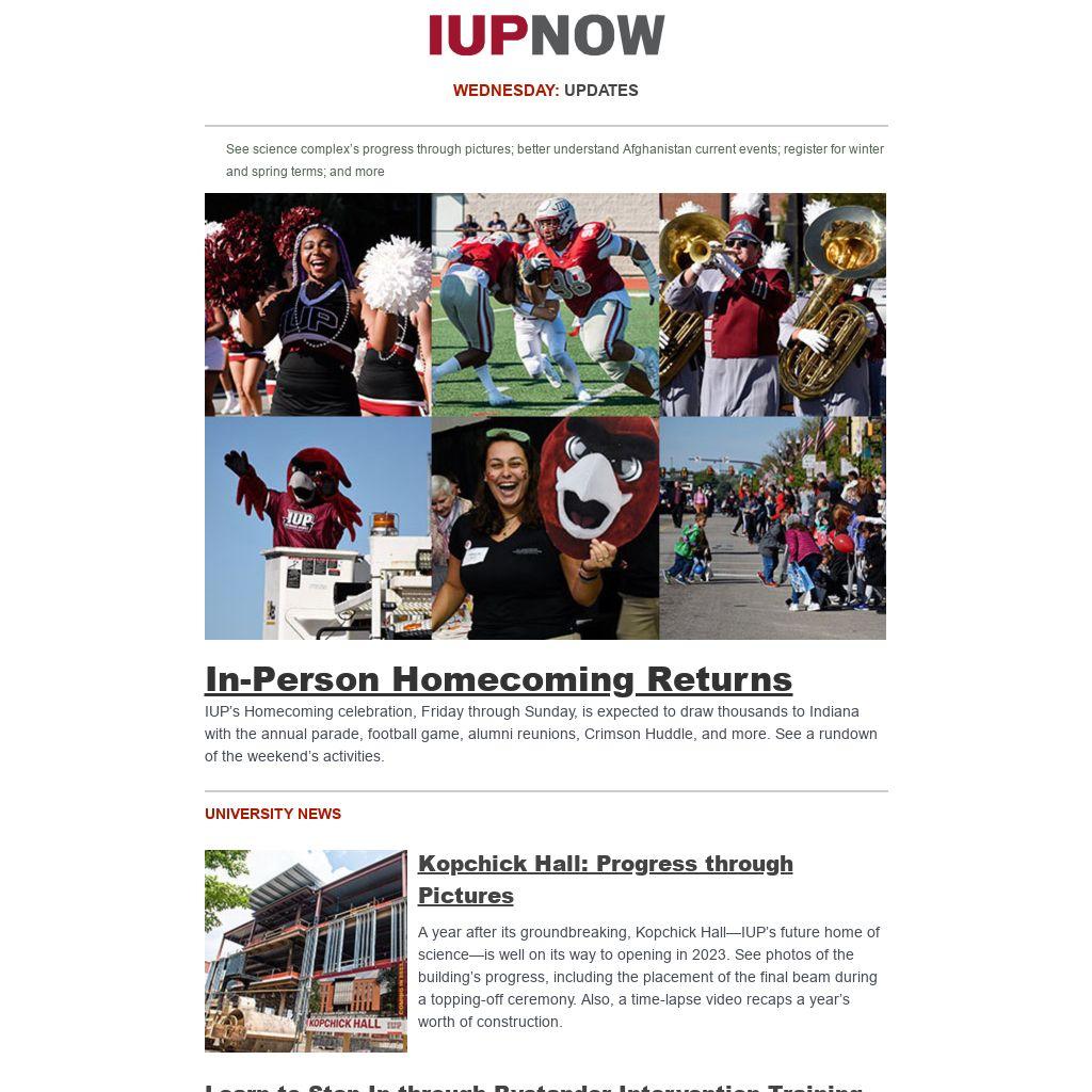 Distributed to IUP employees and students three days a week, IUP Now is the official newsletter of Indiana University of Pennsylvania. It features news from across the IUP website, compiled by the Division of Marketing and Communications. Find out how to get your news and events in IUP Now.