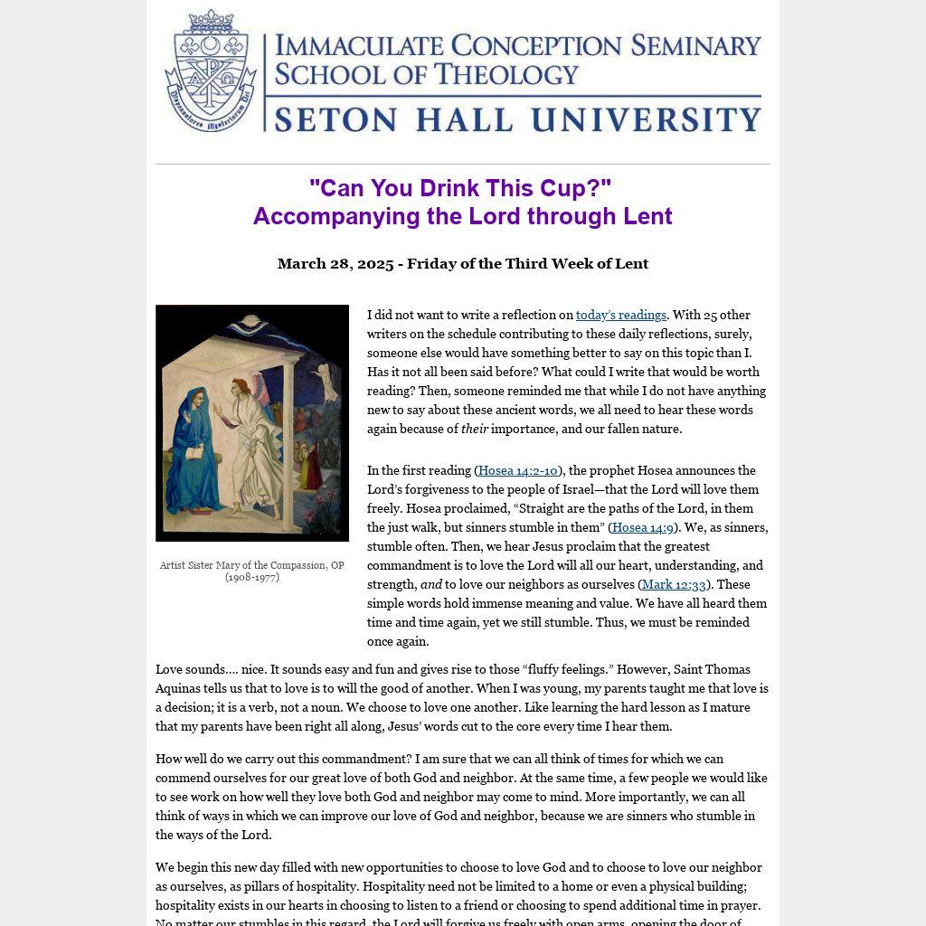 In the first reading (Hosea 14:2-10), the prophet Hosea announces the Lord’s forgiveness to the people of Israel—that the Lord will love them freely. Hosea proclaimed, “Straight are the paths of the Lord, in them the just walk, but sinners stumble in them” (Hosea 14:9). We, as sinners, stumble often. Then, we hear Jesus proclaim that the greatest commandment is to love the Lord will all our heart, understanding, and strength, and to love our neighbors as ourselves (Mark 12:33). These simple words hold immense meaning and value. We have all heard them time and time again, yet we still stumble. Thus, we must be reminded once again.