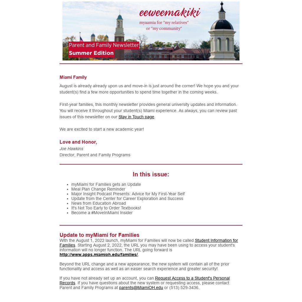 First-year families, this monthly newsletter provides general university updates and information. You will receive it throughout your student(s) Miami experience. As always, you can review past issues of this newsletter on our Stay in Touch page.