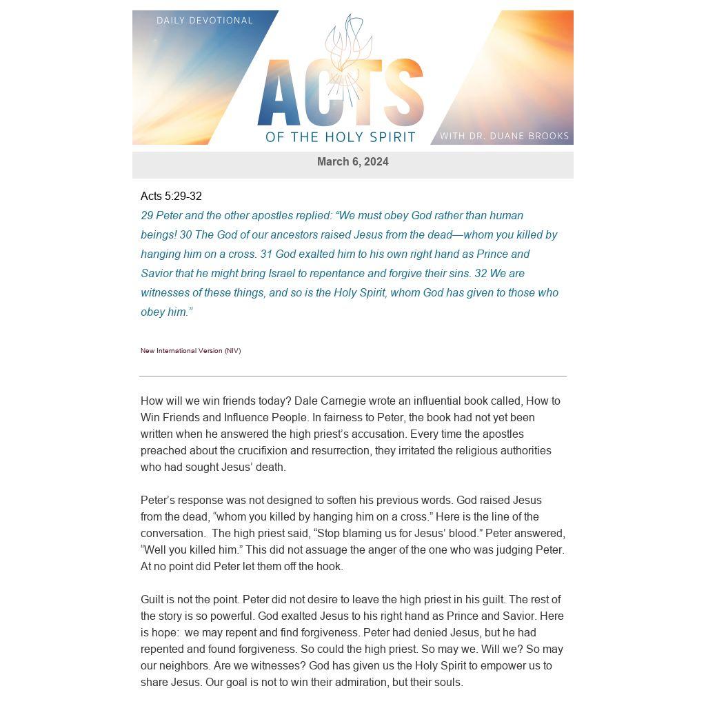 Guilt is not the point. Peter did not desire to leave the high priest in his guilt. The rest of the story is so powerful. God exalted Jesus to his right hand as Prince and Savior. Here is hope: we may repent and find forgiveness. Peter had denied Jesus, but he had repented and found forgiveness. So could the high priest. So may we. Will we? So may our neighbors. Are we witnesses? God has given us the Holy Spirit to empower us to share Jesus. Our goal is not to win their admiration, but their souls.