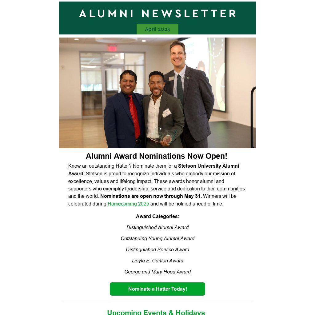 Know an outstanding Hatter? Nominate them for a Stetson University Alumni Award! Stetson is proud to recognize individuals who embody our mission of excellence, values and lifelong impact. These awards honor alumni and supporters who exemplify leadership, service and dedication to their communities and the world. Nominations are open now through May 31. Winners will be celebrated during Homecoming 2025 and will be notified ahead of time.