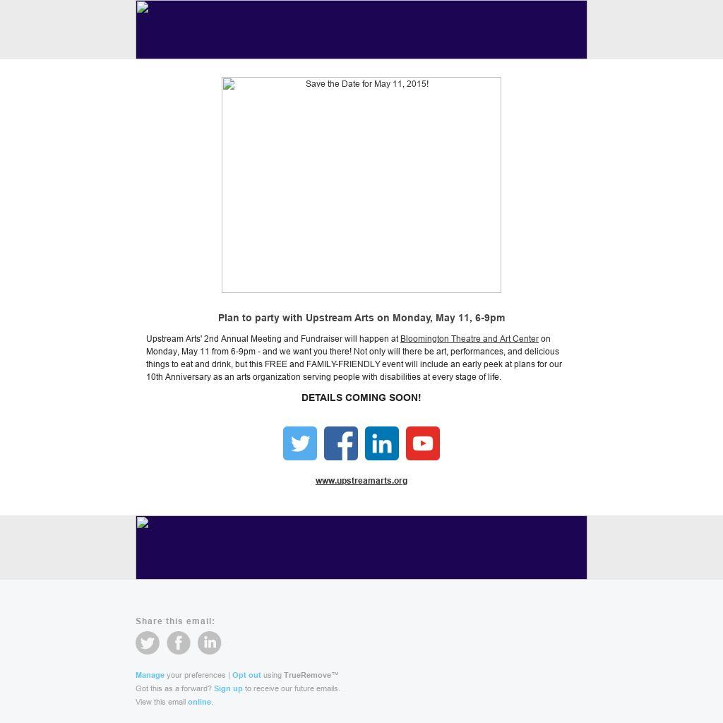 Upstream Arts' 2nd Annual Meeting and Fundraiser will happen at Bloomington Theatre and Art Center on Monday, May 11 from 6-9pm - and we want you there! Not only will there be art, performances, and delicious things to eat and drink, but this FREE and FAMILY-FRIENDLY event will include an early peek at plans for our 10th Anniversary as an arts organization serving people with disabilities at every stage of life. DETAILS COMING SOON!