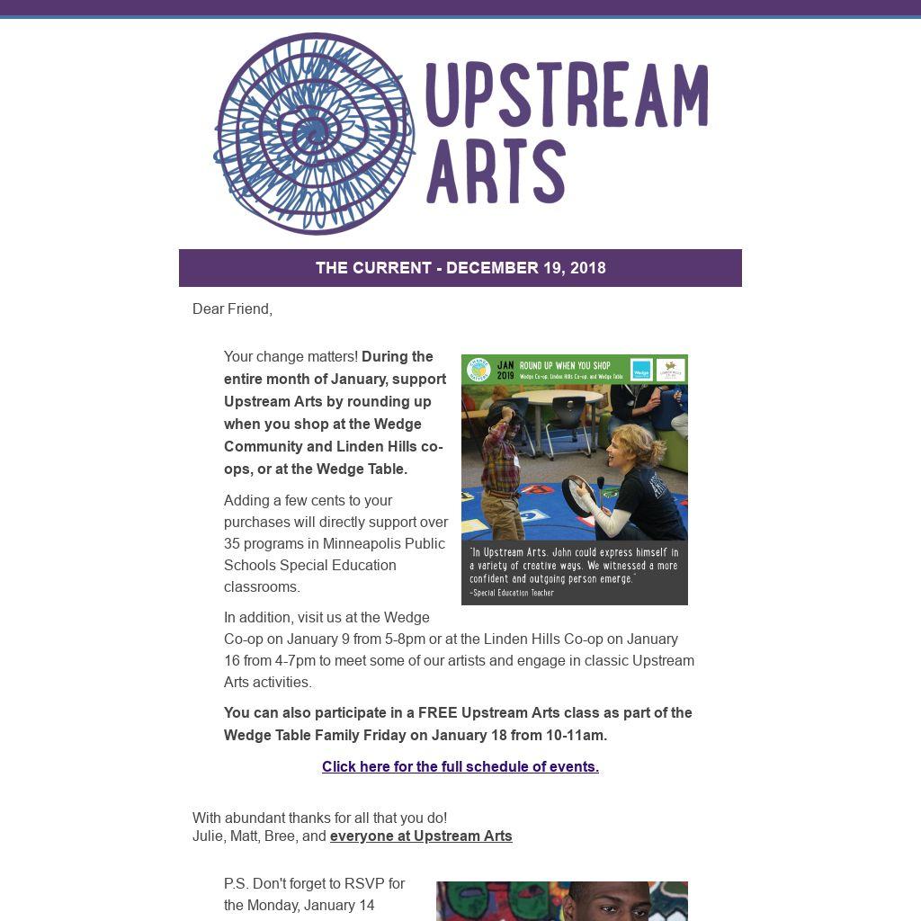 Your change matters! During the entire month of January, support Upstream Arts by rounding up when you shop at the Wedge Community and Linden Hills co-ops, or at the Wedge Table.