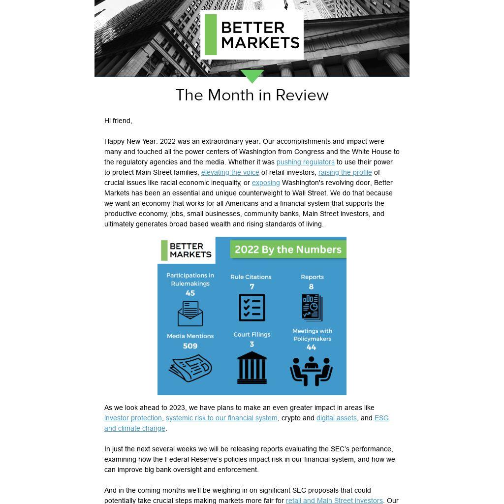 Happy New Year. 2022 was an extraordinary year. Our accomplishments and impact were many and touched all the power centers of Washington from Congress and the White House to the regulatory agencies and the media. Whether it was pushing regulators to use their power to protect Main Street families, elevating the voice of retail investors, raising the profile of crucial issues like racial economic inequality, or exposing Washington's revolving door, Better Markets has been an essential and unique counterweight to Wall Street. We do that because we want an economy that works for all Americans and a financial system that supports the productive economy, jobs, small businesses, community banks, Main Street investors, and ultimately generates broad based wealth and rising standards of living.