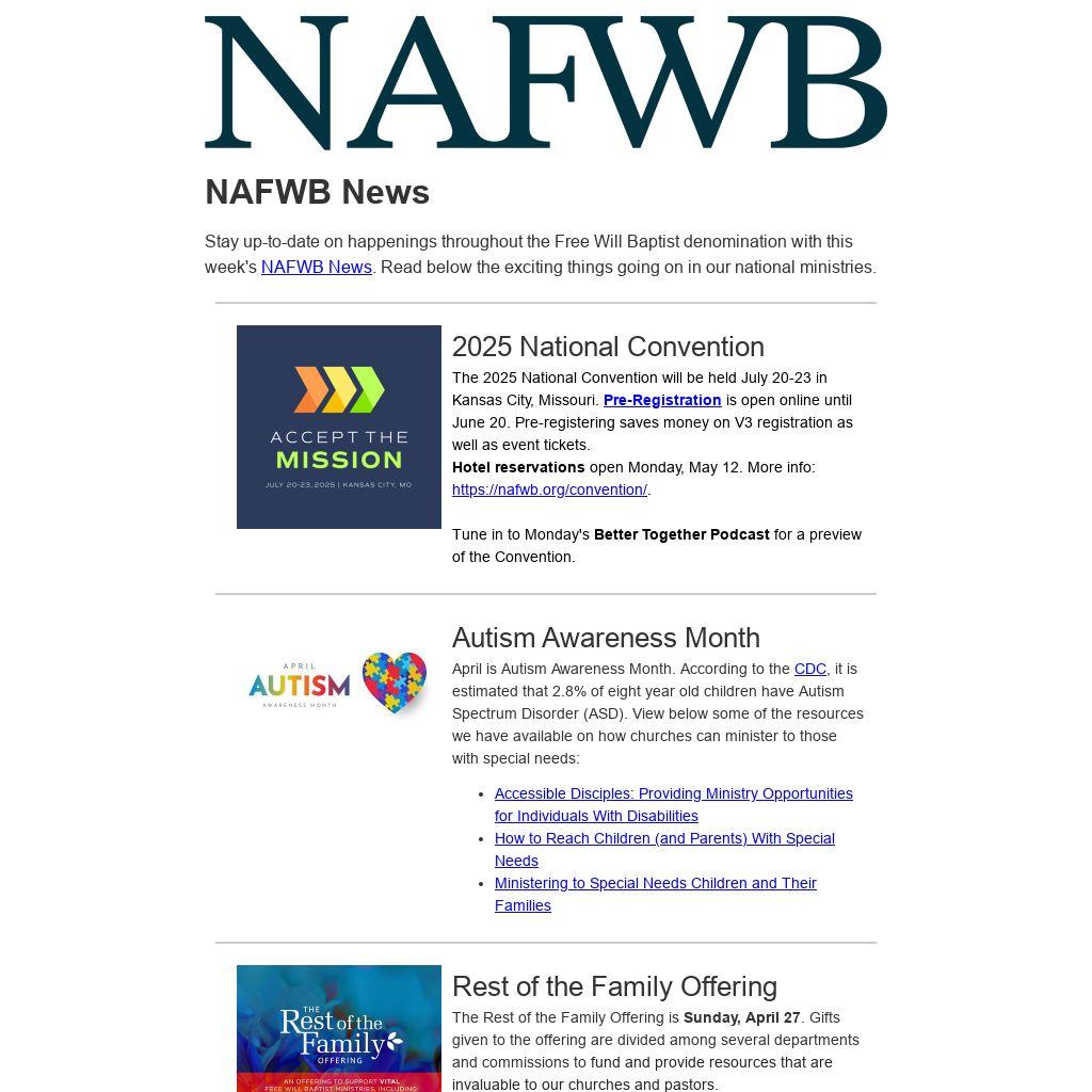 The Rest of the Family Offering is Sunday, April 27. Gifts given to the offering are divided among several departments and commissions to fund and provide resources that are invaluable to our churches and pastors.