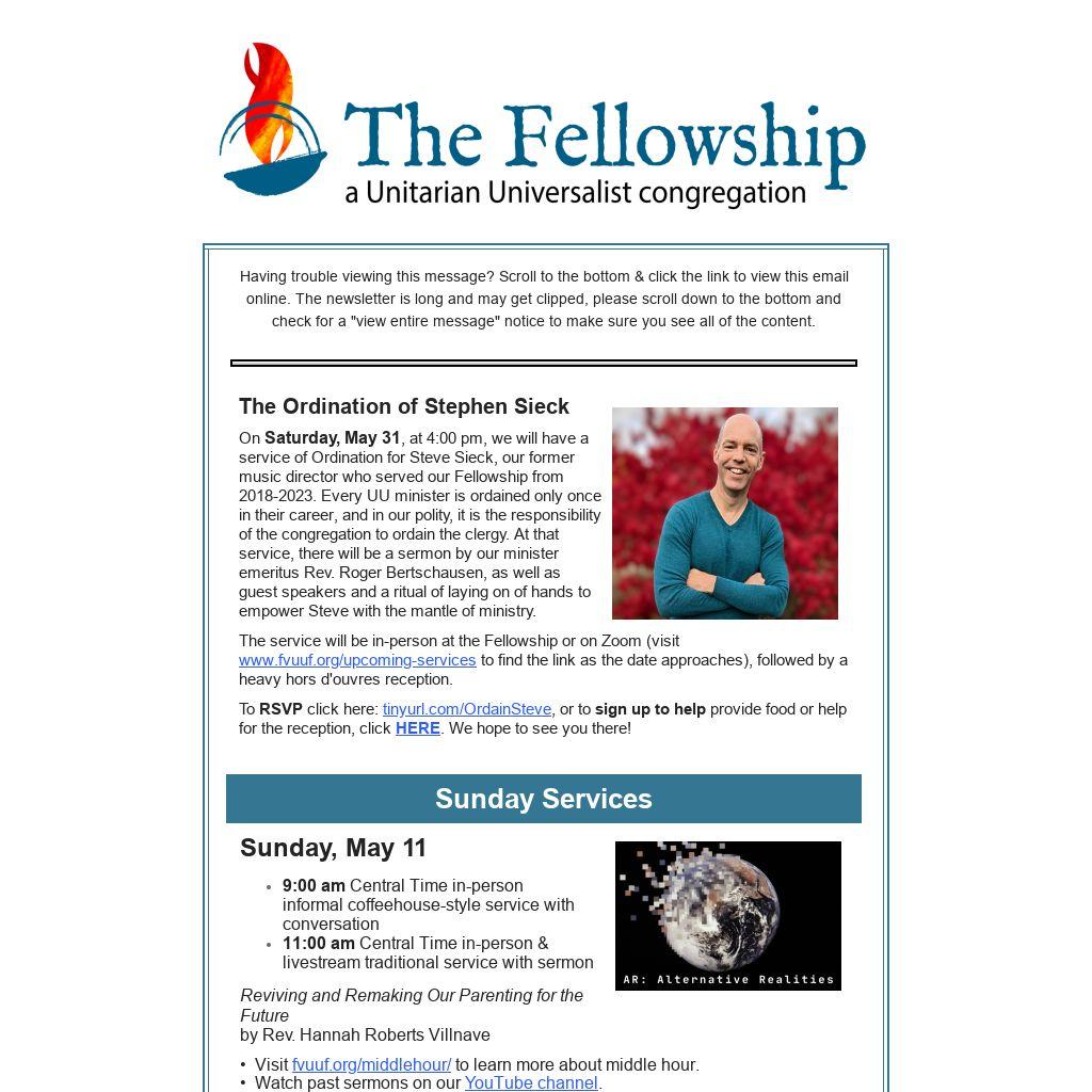 On Saturday, May 31, at 4:00 pm, we will have a service of Ordination for Steve Sieck, our former music director who served our Fellowship from 2018-2023. Every UU minister is ordained only once in their career, and in our polity, it is the responsibility of the congregation to ordain the clergy. At that service, there will be a sermon by our minister emeritus Rev. Roger Bertschausen, as well as guest speakers and a ritual of laying on of hands to empower Steve with the mantle of ministry.