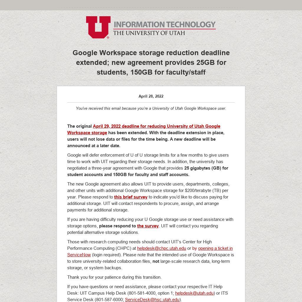 If you are having difficulty reducing your U Google storage use or need assistance with storage options, please respond to the survey. UIT will contact you regarding potential alternative storage solutions.