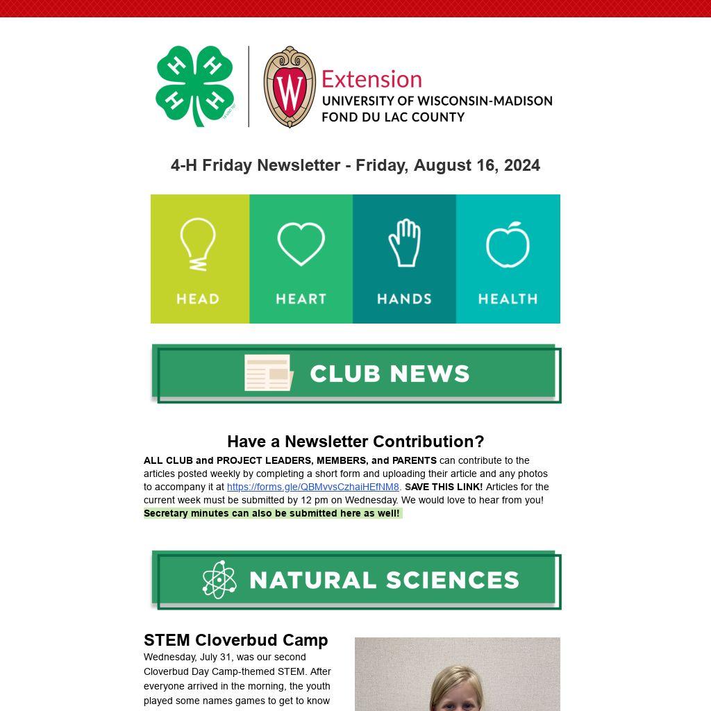 Adult Leaders Meeting, Fair Forum, & Raffle Ticket Drawing - August 21 at 6:30 pmAll parents, adult, and youth leaders, whether you are a project, club, special event, or county leader are invited on August 21 for the Adult Leader’s Association Meeting. Before this meeting, at 6:30 pm, there will be an open conversation on county fair ideas. A fair board rep will be present to hear your feedback on the strengths of the fair and suggestions for changes. After the fair suggestions, the Adult Leaders Meeting will follow. Both meetings will take place at Extension Fond du Lac County, room AE-205/206. The Adult Leader’s Association meets 3 times per year – March, August, and October. This is your opportunity to hear, learn, share, and have input. Mark your calendar for August 21. All clubs are encouraged to have a representative present.