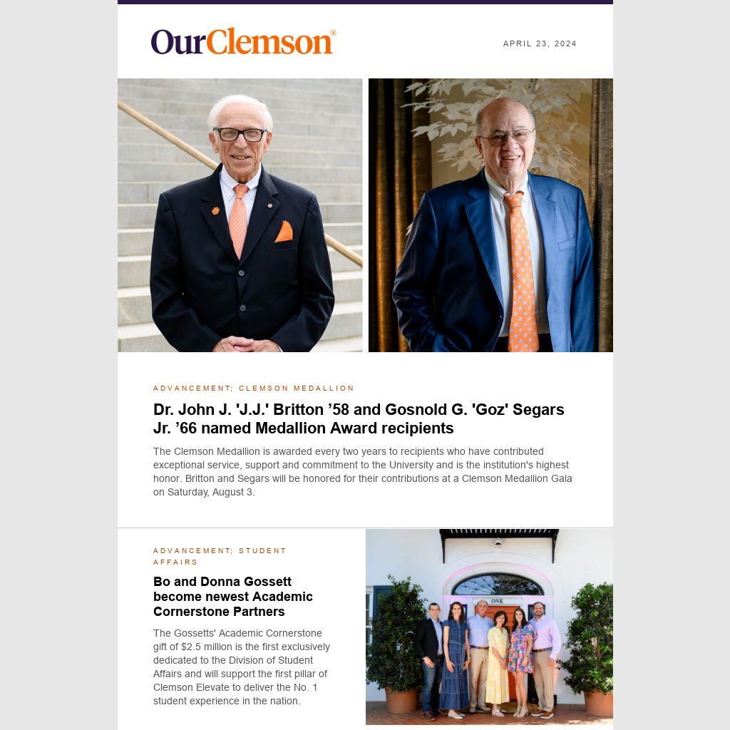 The Clemson Medallion is awarded every two years to recipients who have contributed exceptional service, support and commitment to the University and is the institution's highest honor. Britton and Segars will be honored for their contributions at a Clemson Medallion Gala on Saturday, August 3.