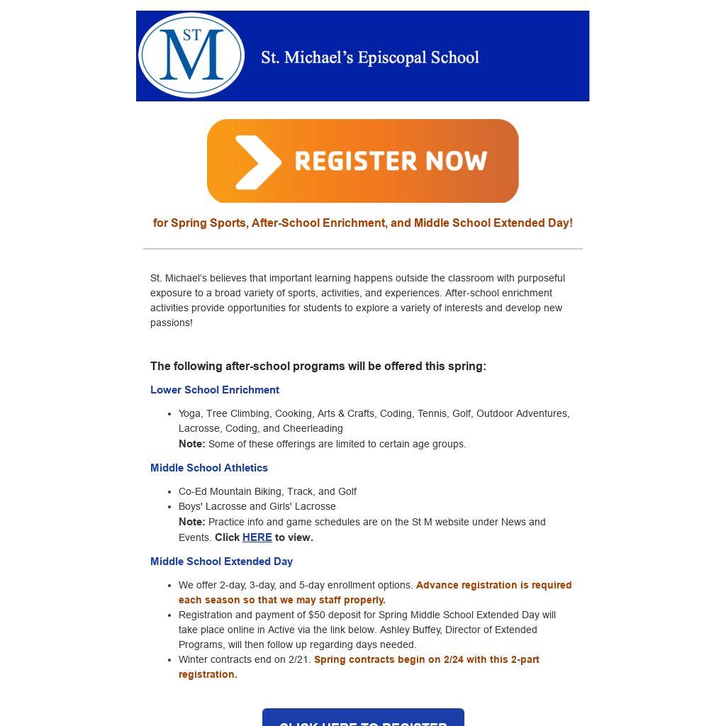 - Registration and payment of $50 deposit for Spring Middle School Extended Day will take place online in Active via the link below. Ashley Buffey, Director of Extended Programs, will then follow up regarding days needed.