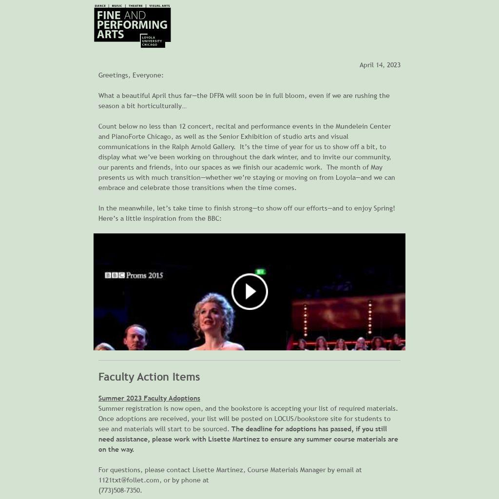 Summer registration is now open, and the bookstore is accepting your list of required materials. Once adoptions are received, your list will be posted on LOCUS/bookstore site for students to see and materials will start to be sourced. The deadline for adoptions has passed, if you still need assistance, please work with Lisette Martinez to ensure any summer course materials are on the way.