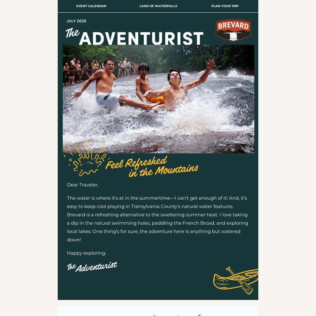 The water is where it’s at in the summertime—I can’t get enough of it! And, it’s easy to keep cool playing in Transylvania County’s natural water features. Brevard is a refreshing alternative to the sweltering summer heat. I love taking a dip in the natural swimming holes, paddling the French Broad, and exploring local lakes. One thing’s for sure, the adventure here is anything but watered down!