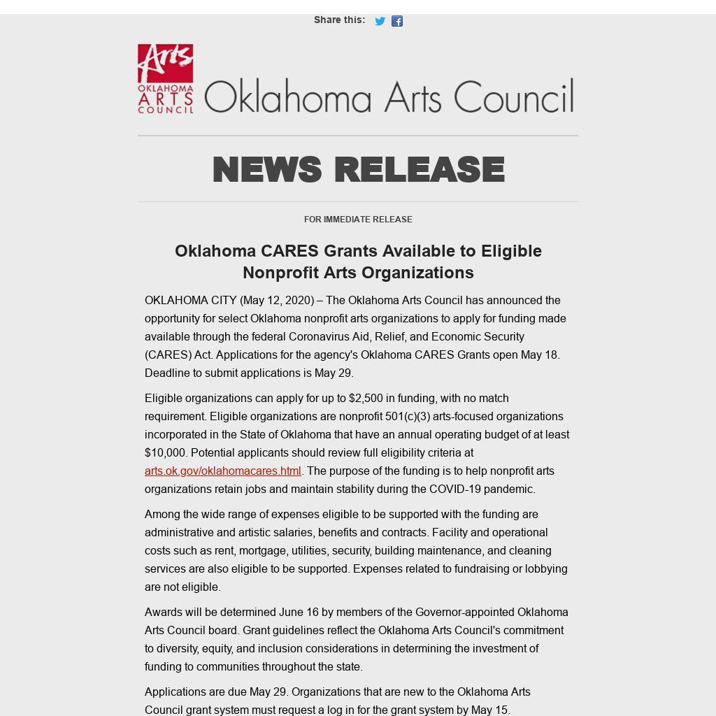 OKLAHOMA CITY (May 12, 2020) – The Oklahoma Arts Council has announced the opportunity for select Oklahoma nonprofit arts organizations to apply for funding made available through the federal Coronavirus Aid, Relief, and Economic Security (CARES) Act. Applications for the agency's Oklahoma CARES Grants open May 18. Deadline to submit applications is May 29.