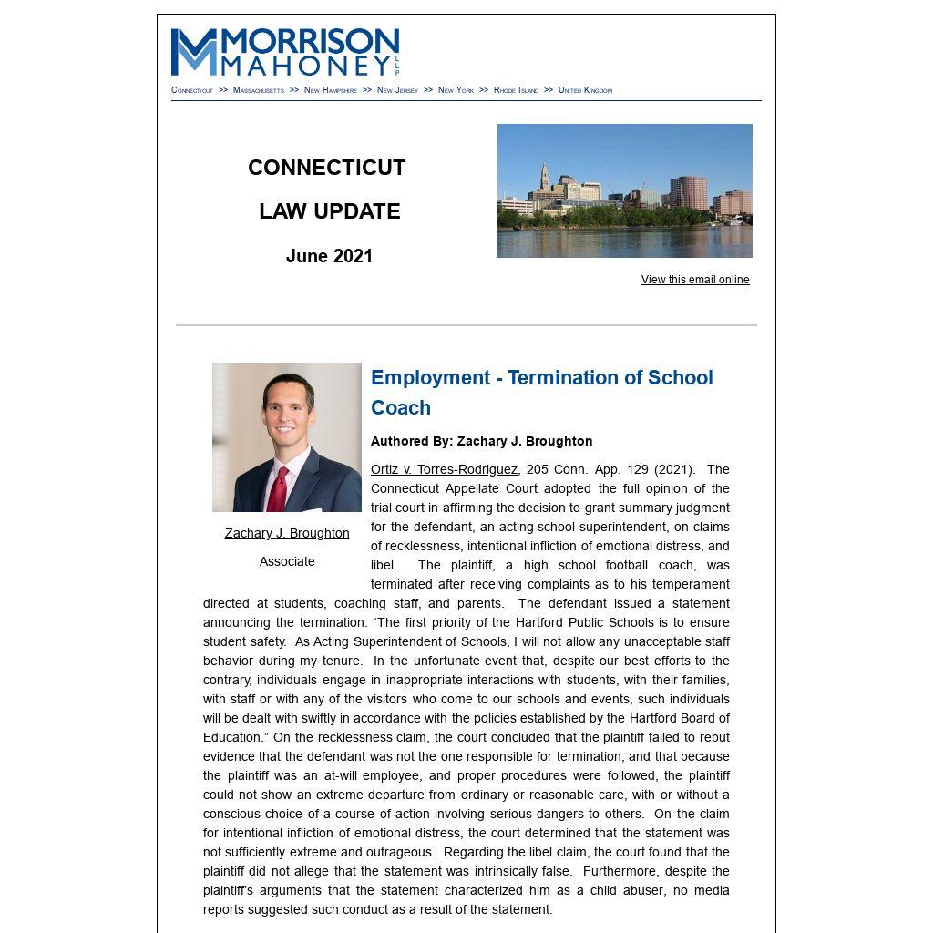 Ortiz v. Torres-Rodriguez, 205 Conn. App. 129 (2021). The Connecticut Appellate Court adopted the full opinion of the trial court in affirming the decision to grant summary judgment for the defendant, an acting school superintendent, on claims of recklessness, intentional infliction of emotional distress, and libel. The plaintiff, a high school football coach, was terminated after receiving complaints as to his temperament directed at students, coaching staff, and parents. The defendant issued a statement announcing the termination: “The first priority of the Hartford Public Schools is to ensure student safety. As Acting Superintendent of Schools, I will not allow any unacceptable staff behavior during my tenure. In the unfortunate event that, despite our best efforts to the contrary, individuals engage in inappropriate interactions with students, with their families, with staff or with any of the visitors who come to our schools and events, such individuals will be dealt with swiftly in accordance with the policies established by the Hartford Board of Education.” On the recklessness claim, the court concluded that the plaintiff failed to rebut evidence that the defendant was not the one responsible for termination, and that because the plaintiff was an at-will employee, and proper procedures were followed, the plaintiff could not show an extreme departure from ordinary or reasonable care, with or without a conscious choice of a course of action involving serious dangers to others. On the claim for intentional infliction of emotional distress, the court determined that the statement was not sufficiently extreme and outrageous. Regarding the libel claim, the court found that the plaintiff did not allege that the statement was intrinsically false. Furthermore, despite the plaintiff’s arguments that the statement characterized him as a child abuser, no media reports suggested such conduct as a result of the statement.