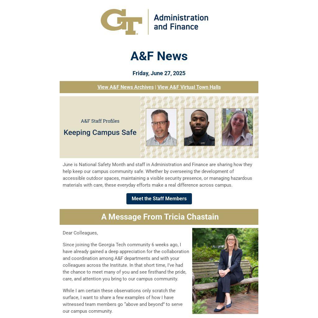 Since joining the Georgia Tech community 6 weeks ago, I have already gained a deep appreciation for the collaboration and coordination among A&F departments and with your colleagues across the Institute. In that short time, I’ve had the chance to meet many of you and see firsthand the pride, care, and attention you bring to our campus community.