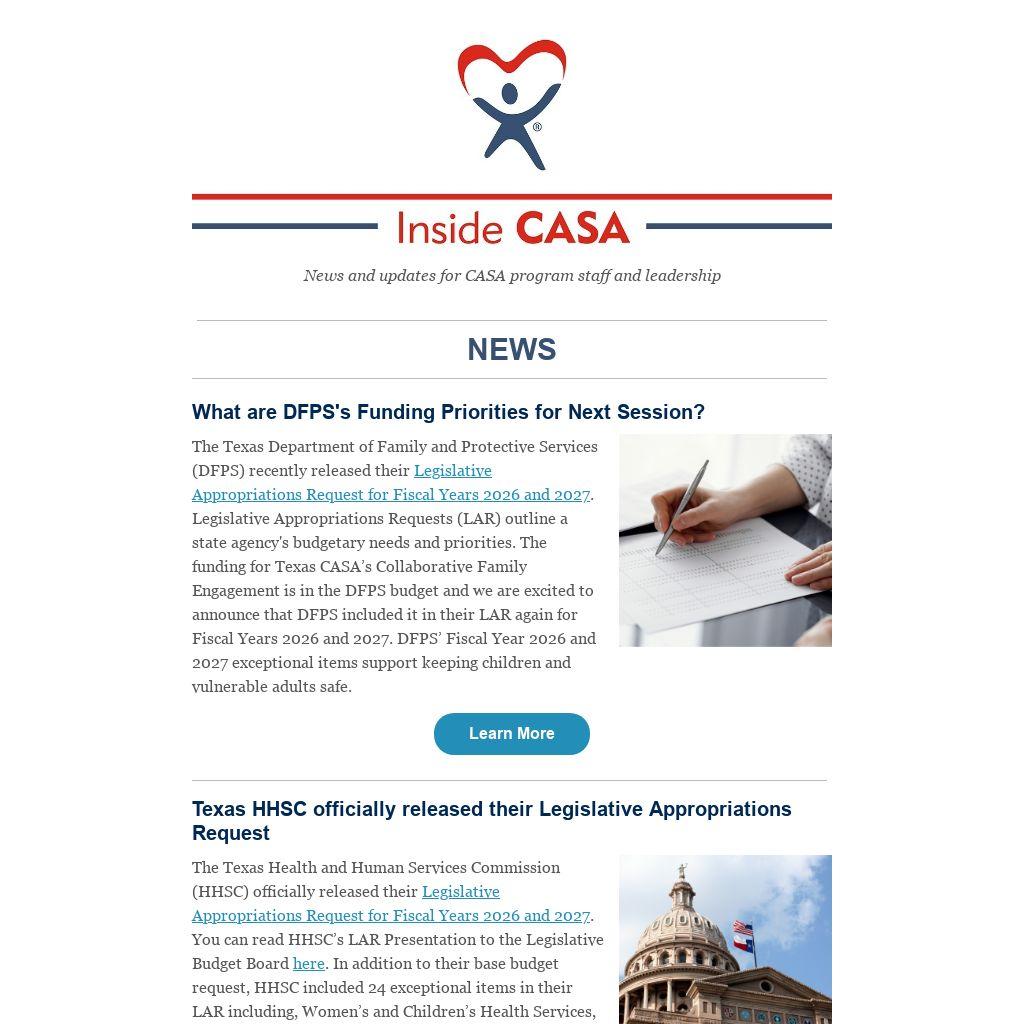 The Texas Department of Family and Protective Services (DFPS) recently released their Legislative Appropriations Request for Fiscal Years 2026 and 2027. Legislative Appropriations Requests (LAR) outline a state agency's budgetary needs and priorities. The funding for Texas CASA’s Collaborative Family Engagement is in the DFPS budget and we are excited to announce that DFPS included it in their LAR again for Fiscal Years 2026 and 2027. DFPS’ Fiscal Year 2026 and 2027 exceptional items support keeping children and vulnerable adults safe.
