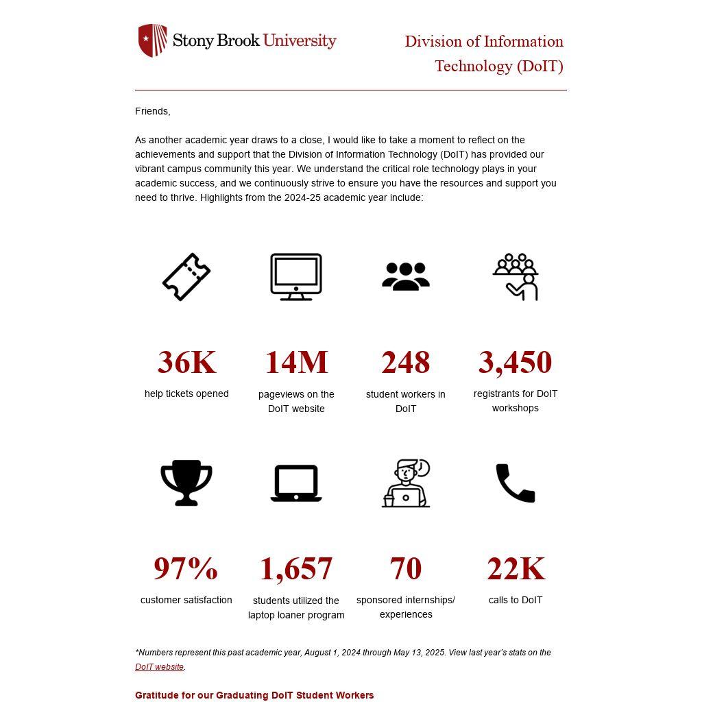As another academic year draws to a close, I would like to take a moment to reflect on the achievements and support that the Division of Information Technology (DoIT) has provided our vibrant campus community this year. We understand the critical role technology plays in your academic success, and we continuously strive to ensure you have the resources and support you need to thrive. Highlights from the 2024-25 academic year include: