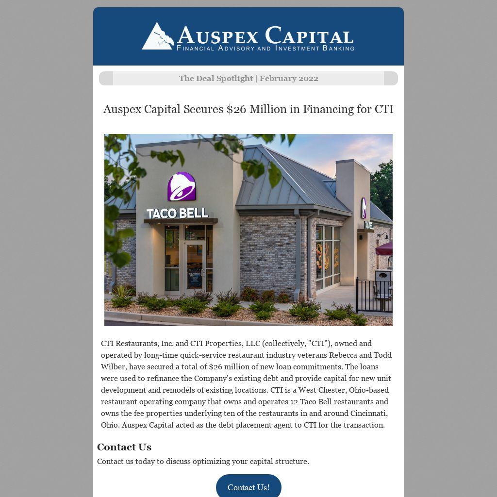 CTI Restaurants, Inc. and CTI Properties, LLC (collectively, "CTI”), owned and operated by long-time quick-service restaurant industry veterans Rebecca and Todd Wilber, have secured a total of $26 million of new loan commitments. The loans were used to refinance the Company’s existing debt and provide capital for new unit development and remodels of existing locations. CTI is a West Chester, Ohio-based restaurant operating company that owns and operates 12 Taco Bell restaurants and owns the fee properties underlying ten of the restaurants in and around Cincinnati, Ohio. Auspex Capital acted as the debt placement agent to CTI for the transaction.
