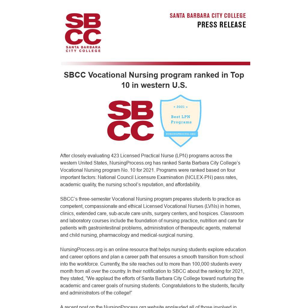 After closely evaluating 423 Licensed Practical Nurse (LPN) programs across the western United States, NursingProcess.org has ranked Santa Barbara City College’s Vocational Nursing program No. 10 for 2021. Programs were ranked based on four important factors: National Council Licensure Examination (NCLEX-PN) pass rates, academic quality, the nursing school’s reputation, and affordability.