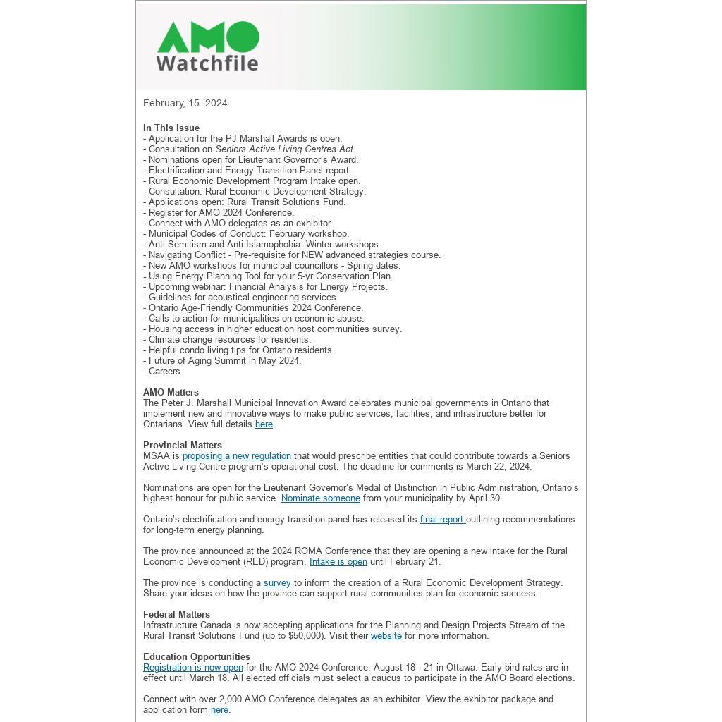 *Disclaimer: The Association of Municipalities of Ontario (AMO) is unable to provide any warranty regarding the accuracy or completeness of third-party submissions. Distribution of these items does not imply an endorsement of the views, information or services mentioned.