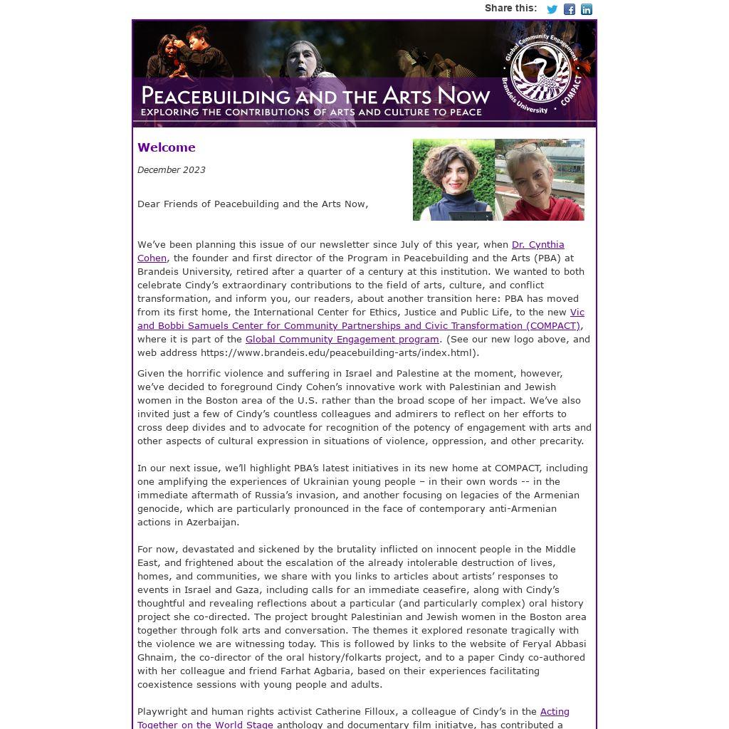 We’ve been planning this issue of our newsletter since July of this year, when Dr. Cynthia Cohen, the founder and first director of the Program in Peacebuilding and the Arts (PBA) at Brandeis University, retired after a quarter of a century at this institution. We wanted to both celebrate Cindy’s extraordinary contributions to the field of arts, culture, and conflict transformation, and inform you, our readers, about another transition here: PBA has moved from its first home, the International Center for Ethics, Justice and Public Life, to the new Vic and Bobbi Samuels Center for Community Partnerships and Civic Transformation (COMPACT), where it is part of the Global Community Engagement program. (See our new logo above, and web address https://www.brandeis.edu/peacebuilding-arts/index.html).