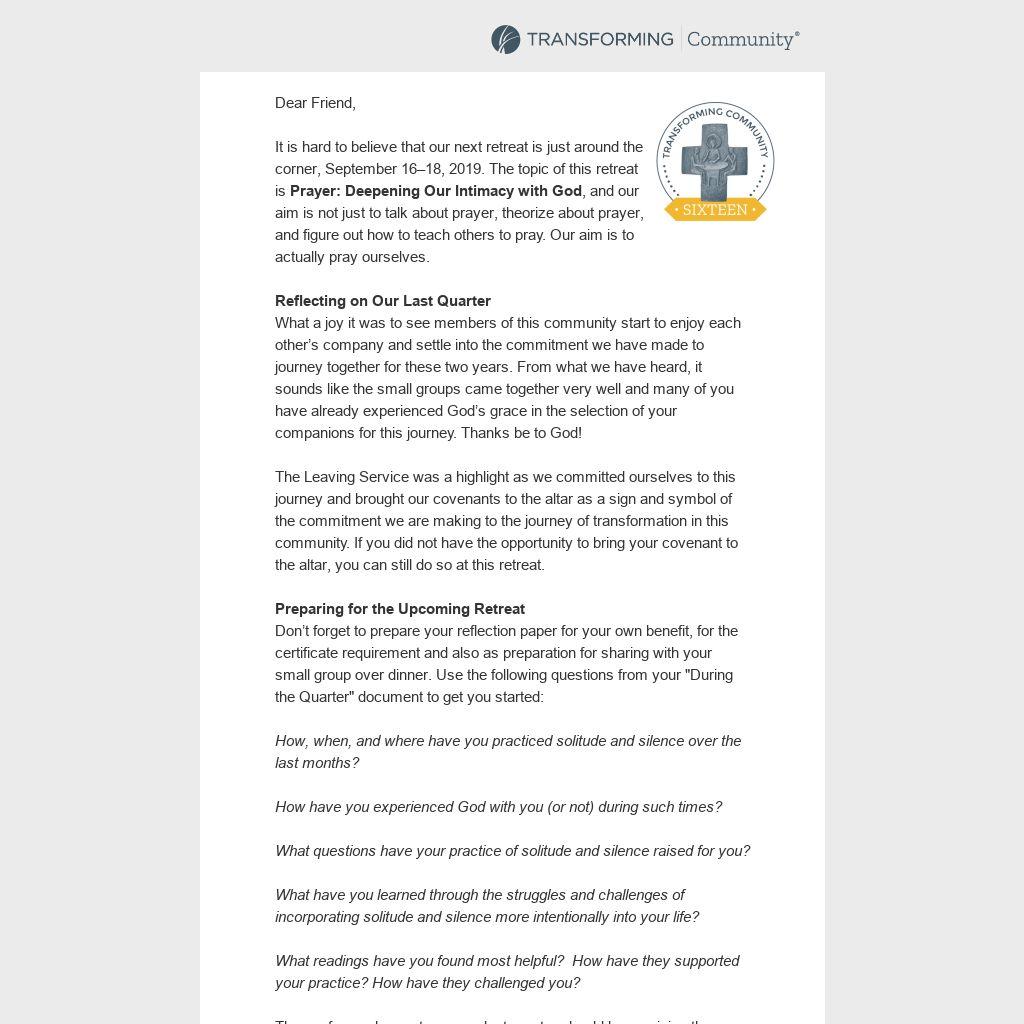 It is hard to believe that our next retreat is just around the corner, September 16–18, 2019. The topic of this retreat is Prayer: Deepening Our Intimacy with God, and our aim is not just to talk about prayer, theorize about prayer, and figure out how to teach others to pray. Our aim is to actually pray ourselves.