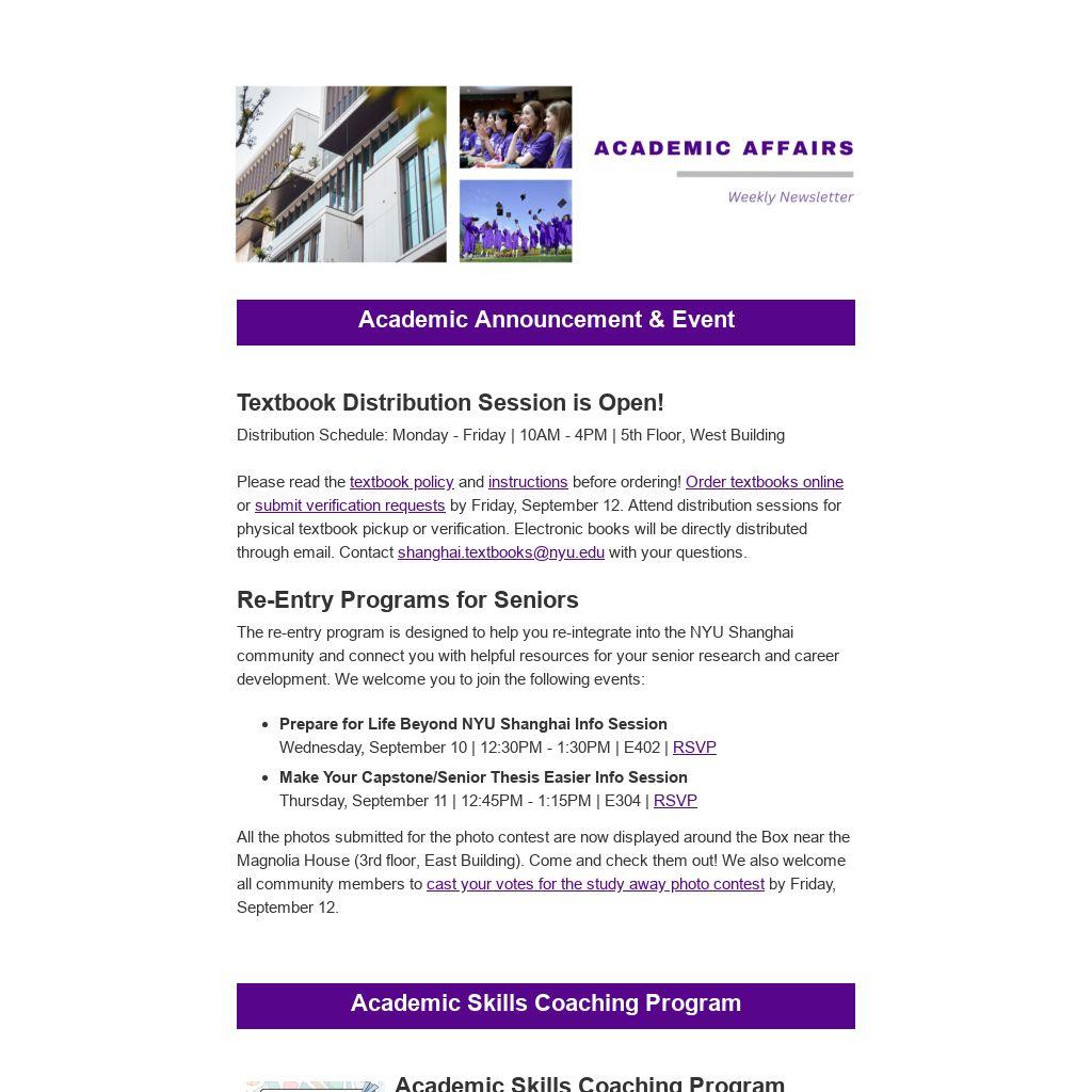 The re-entry program is designed to help you re-integrate into the NYU Shanghai community and connect you with helpful resources for your senior research and career development. We welcome you to join the following events: