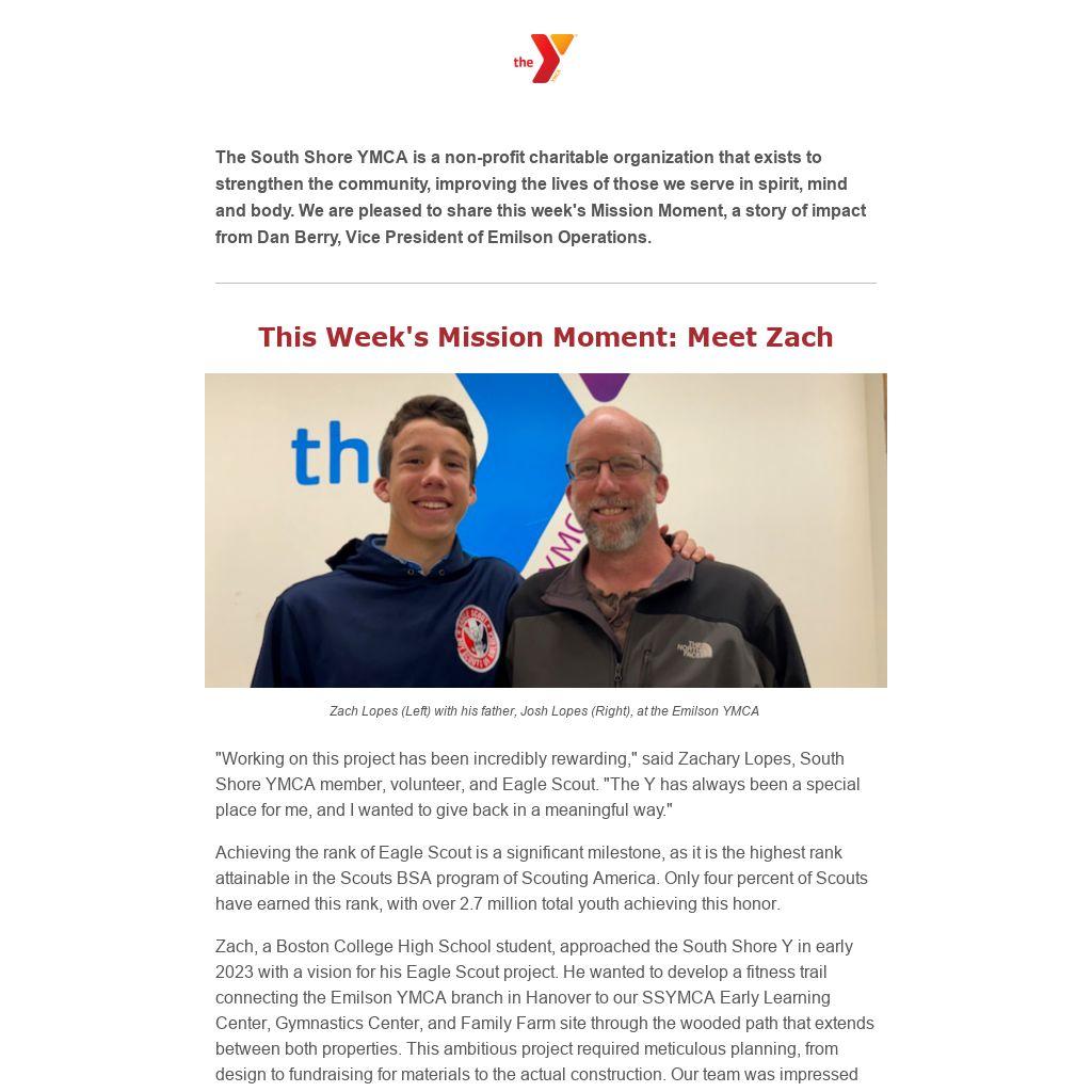 For his Eagle Scout project, Zach worked on creating five fitness stations along the new “Strength Adventure Trail." He solicited donations of materials and volunteers to help construct the stations over several months. Zach collaborated with our Health & Wellness team and Marketing Department to develop signage for each station, ensuring that Y members could easily identify and use them properly. In total, 40 volunteers contributed 320 hours to the project, with Zach himself dedicating over 200 hours. Zach's father, Josh Lopes, expressed immense pride in his son's accomplishment.