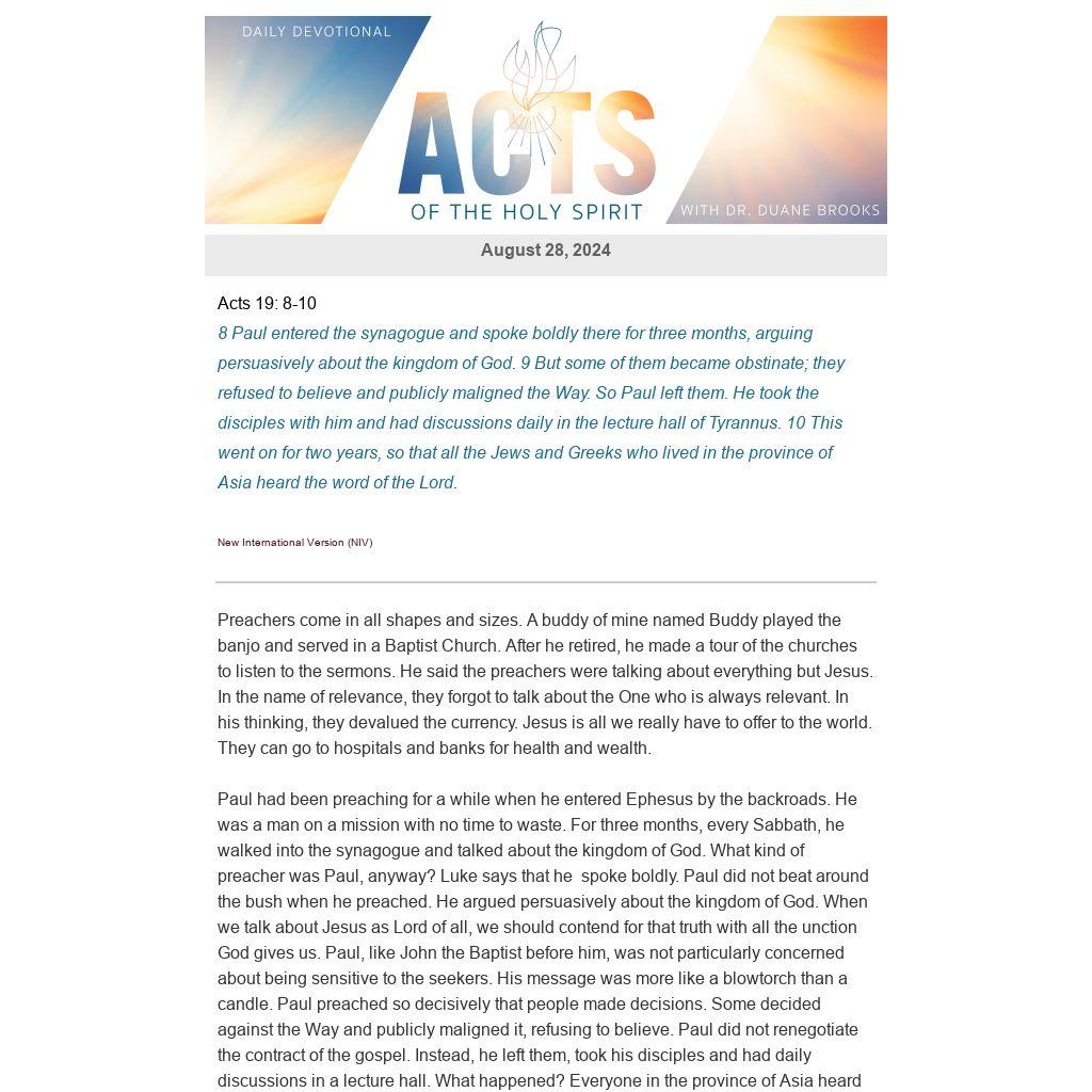 Paul had been preaching for a while when he entered Ephesus by the backroads. He was a man on a mission with no time to waste. For three months, every Sabbath, he walked into the synagogue and talked about the kingdom of God. What kind of preacher was Paul, anyway? Luke says that he spoke boldly. Paul did not beat around the bush when he preached. He argued persuasively about the kingdom of God. When we talk about Jesus as Lord of all, we should contend for that truth with all the unction God gives us. Paul, like John the Baptist before him, was not particularly concerned about being sensitive to the seekers. His message was more like a blowtorch than a candle. Paul preached so decisively that people made decisions. Some decided against the Way and publicly maligned it, refusing to believe. Paul did not renegotiate the contract of the gospel. Instead, he left them, took his disciples and had daily discussions in a lecture hall. What happened? Everyone in the province of Asia heard the word of the Lord.