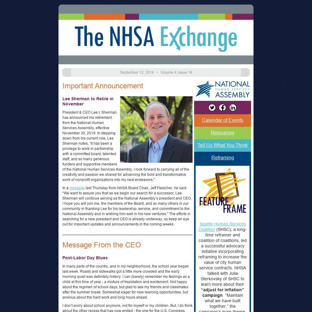 President & CEO Lee I. Sherman has announced his retirement from the National Human Services Assembly, effective November 30, 2019. In stepping down from his current role, Lee Sherman notes, “It has been a privilege to work in partnership with a committed board, talented staff, and so many generous funders and supportive members of the National Human Services Assembly. I look forward to carrying all of the creativity and passion we shared for advancing the bold and transformative work of nonprofit organizations into my next endeavors."