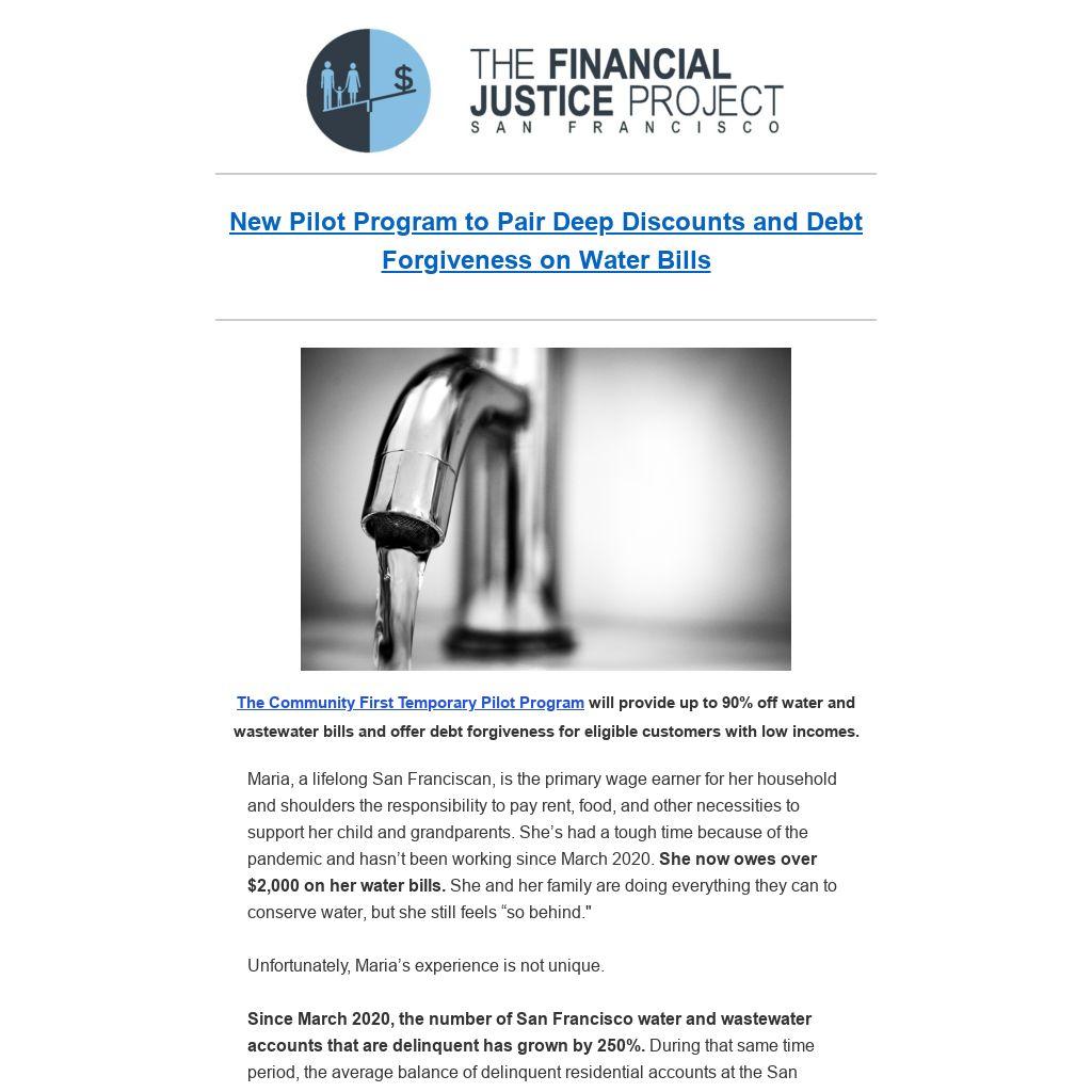 Since March 2020, the number of San Francisco water and wastewater accounts that are delinquent has grown by 250%. During that same time period, the average balance of delinquent residential accounts at the San Francisco Public Utilities Commission (SFPUC) has increased by 93% to more than $1,000 of water and wastewater debt per household. Households with low incomes and in communities of color have been disproportionately impacted.