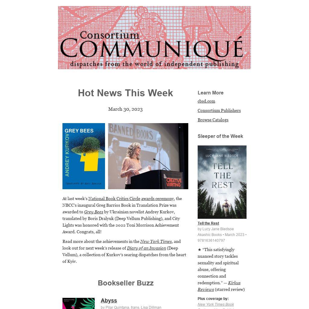 At last week’s National Book Critics Circle awards ceremony, the NBCC’s inaugural Greg Barrios Book in Translation Prize was awarded to Grey Bees by Ukrainian novelist Andrey Kurkov, translated by Boris Dralyuk (Deep Vellum Publishing), and City Lights was honored with the 2022 Toni Morrison Achievement Award. Congrats, all!