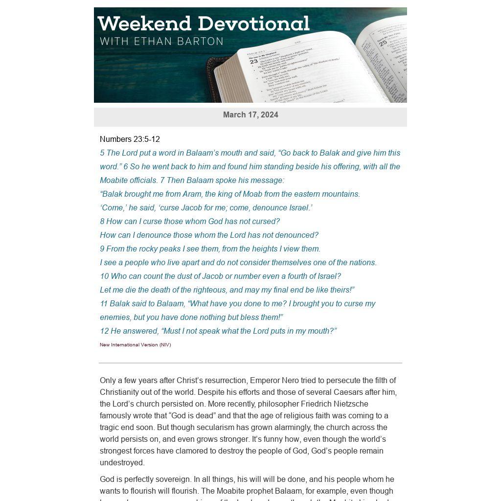 Should this not be a story of comfort for his church today? Even when we’re surrounded by calamity and evil, God will not allow us to befall anything that destroys us. Christianity has always been under attack, just like Israel was before Christ—but never has any attack been able to overcome the perfect power and will of the God who sustains us. Do you think the Israelites feared Balaam’s curses? How could they when they had the Almighty sovereign God of the universe on their side? That same God is on our side too, and he has promised that his will will be done, his protected people will flourish, and his kingdom will stand for eternity. Praise God, we have nothing to fear!