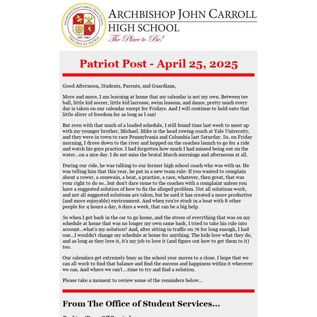 Yesterday, a letter was sent out to all parents, asking them to complete the Title I Family Survey for the 24-25 school year. This information allows Archbishop Carroll to access specific materials and services for our students. As close to 100% participation in the survey is necessary for us to maximize our available resources.