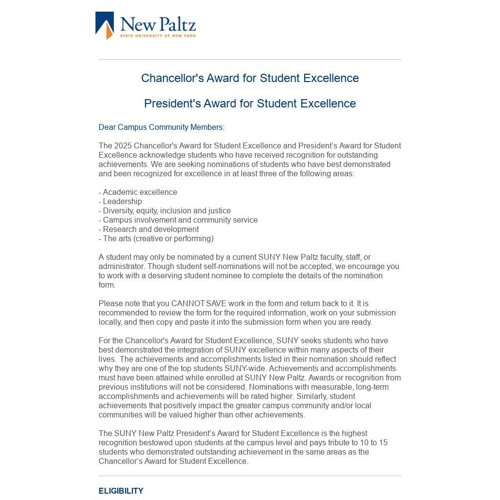 For the Chancellor's Award for Student Excellence, SUNY seeks students who have best demonstrated the integration of SUNY excellence within many aspects of their lives. The achievements and accomplishments listed in their nomination should reflect why they are one of the top students SUNY-wide. Achievements and accomplishments must have been attained while enrolled at SUNY New Paltz. Awards or recognition from previous institutions will not be considered. Nominations with measurable, long-term accomplishments and achievements will be rated higher. Similarly, student achievements that positively impact the greater campus community and/or local communities will be valued higher than other achievements.