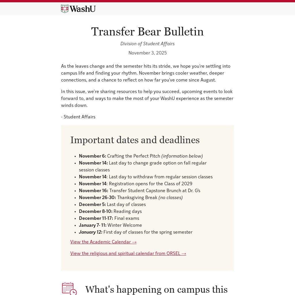 In this issue, we’re sharing resources to help you succeed, upcoming events to look forward to, and ways to make the most of your WashU experience as the semester winds down.