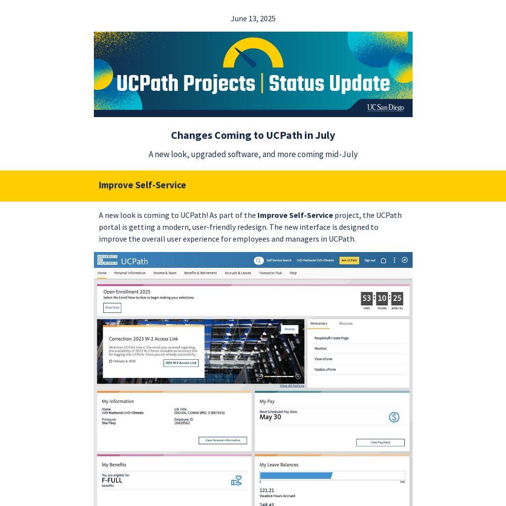 UCPath will be unavailable from Friday, July 11, 2025 at 12:00 pm to Monday, July 14, 2025 at 6:00 am to implement the July Release projects. During the scheduled downtime, employees, managers, and transactors will not have access to the system.