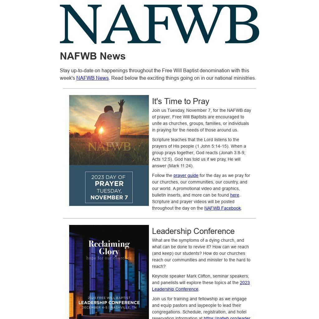 Join us Tuesday, November 7, for the NAFWB day of prayer. Free Will Baptists are encouraged to unite as churches, groups, families, or individuals in praying for the needs of those around us.