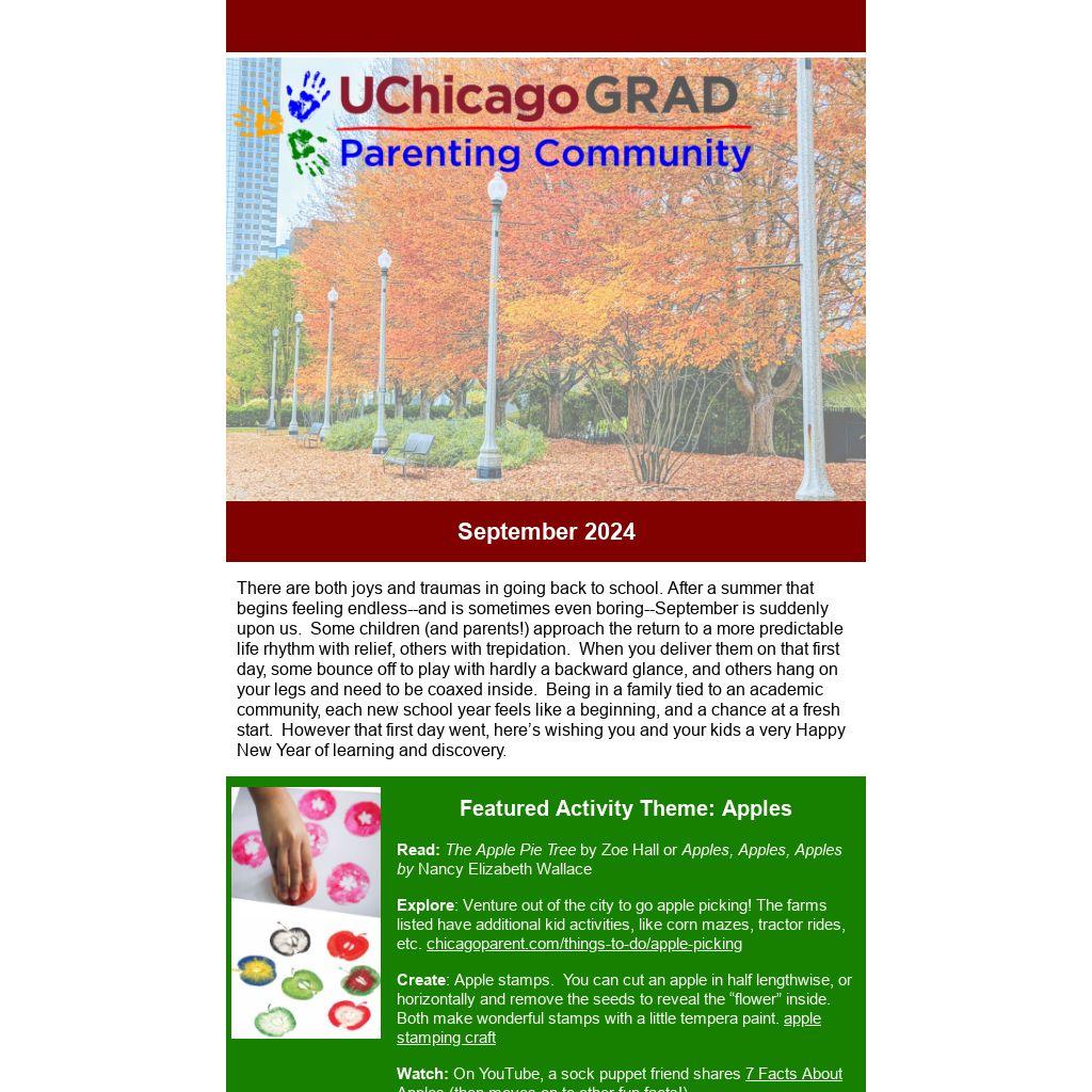 We will be officially introducing the UChicagoGRAD Parenting Community this fall, with weekly classes and playtimes, monthly family mixers and student Parent Write-Ins in various campus locations. For details visit our website and sign up for the Studentparent listserv (if you haven’t already.) We hope you will be a vital part of this community and help our programming grow. grad.uchicago.edu/family-resources