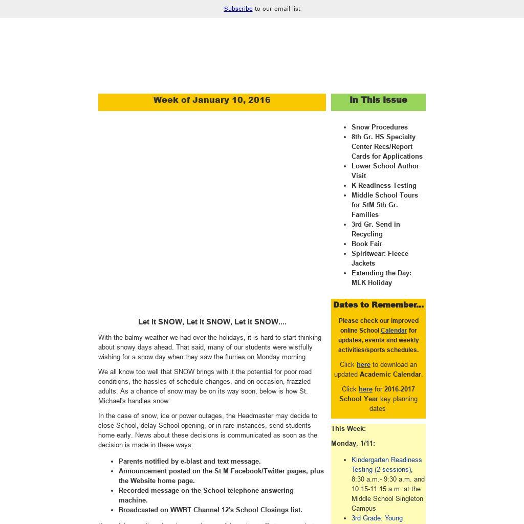 We all know too well that SNOW brings with it the potential for poor road conditions, the hassles of schedule changes, and on occasion, frazzled adults. As a chance of snow may be on its way soon, below is how St. Michael's handles snow: