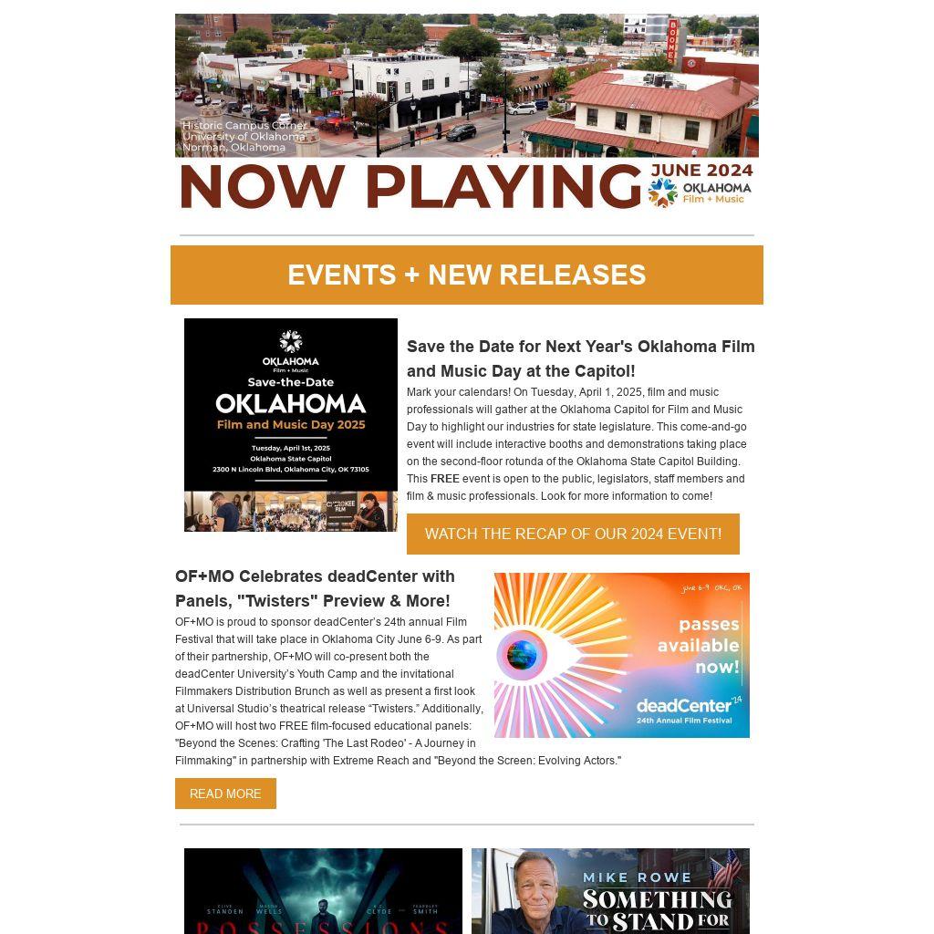 OF+MO Celebrates deadCenter with Panels, "Twisters" Preview & More! OF+MO is proud to sponsor deadCenter’s 24th annual Film Festival that will take place in Oklahoma City June 6-9. As part of their partnership, OF+MO will co-present both the deadCenter University’s Youth Camp and the invitational Filmmakers Distribution Brunch as well as present a first look at Universal Studio’s theatrical release “Twisters.” Additionally, OF+MO will host two FREE film-focused educational panels: "Beyond the Scenes: Crafting 'The Last Rodeo' - A Journey in Filmmaking" in partnership with Extreme Reach and "Beyond the Screen: Evolving Actors."