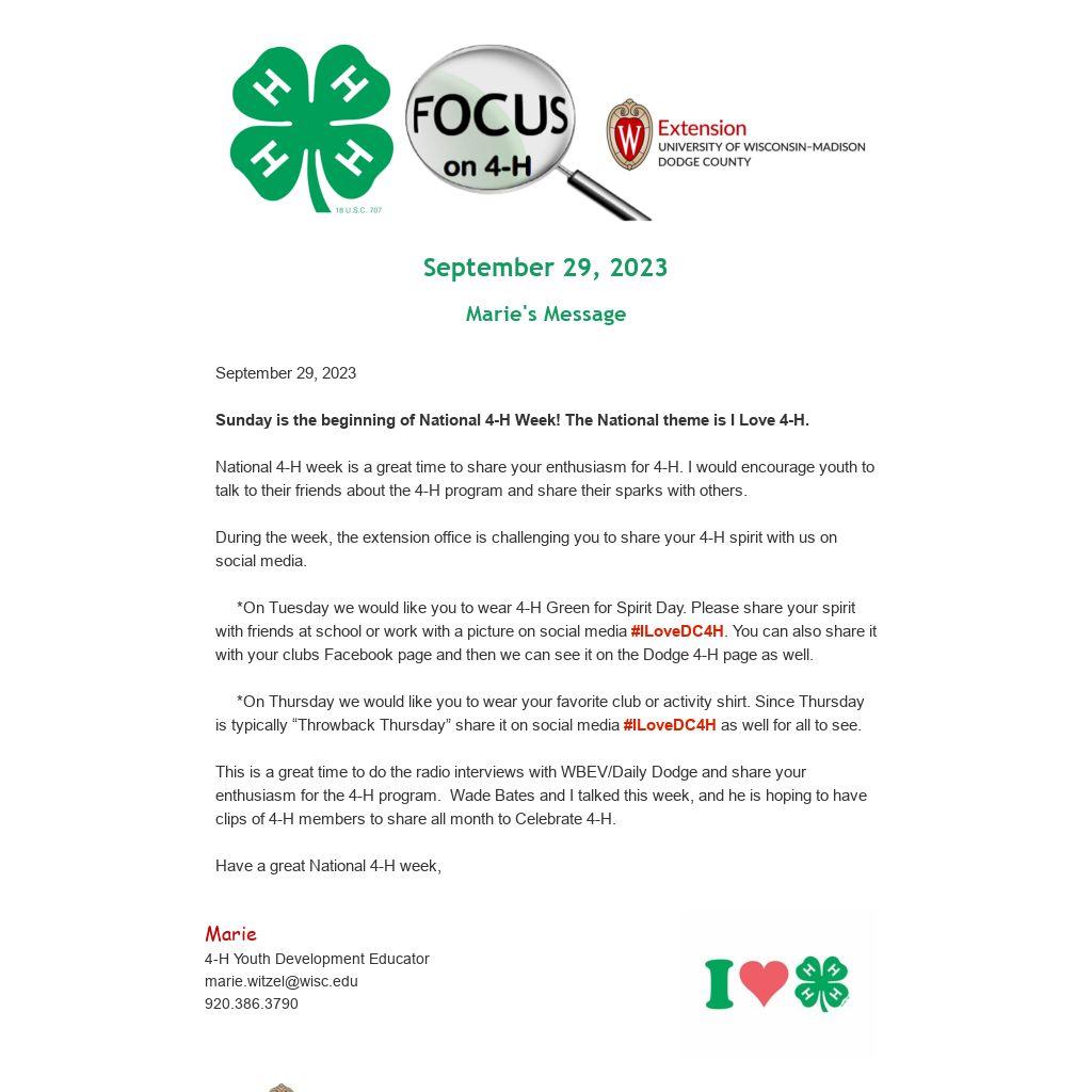 This is a great time to do the radio interviews with WBEV/Daily Dodge and share your enthusiasm for the 4-H program. Wade Bates and I talked this week, and he is hoping to have clips of 4-H members to share all month to Celebrate 4-H.